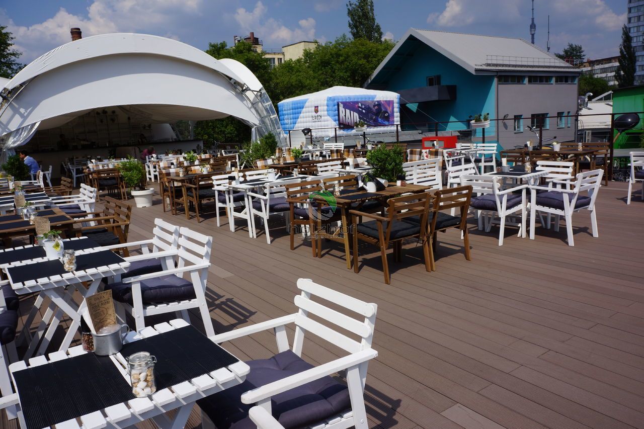 Проходимость с барах Москвы очень большая, и не каждое покрытие пола выдержит бурные выходные с танцами девушек на каблуках. В кафе - бар «Искра» смонтирована качественная террасная доска, которая выдержит не только большой поток посетителей, танцы на каблуках но и погодные перемены на открытой террасе. Проведя предварительную работу, была выбрана шовная террасная доска на регулируемых опорах , отлично подходящая по всем характеристикам. Теперь посетители бара, смогут весело и комфортно отдыхать.